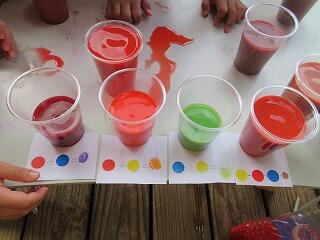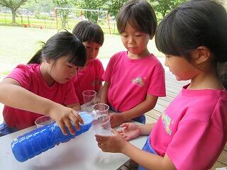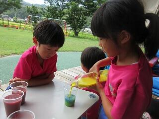 今日は、絵の具を使って色水遊びをしました。今日の色は、赤・青・黄。「あっ!信号の色だ」と言っていた子もいました。好きな色をコップの中に混ぜて、ジュース作りが始まっていましたよ。作った後は、何ジュースが出来たのか、一人ずつ発表タイム♪「青に赤をいっぱい入れて濃いぶろうジュースが出来たよ」「これは、オレンジジュース」「これは、茶色だけココア」といろいろな味が完成☆「私のジュースと〇〇ちゃんのジュースの色、似とるな」と友達のジュースと比べ合いをしている子もおり、たまたま作ったジュースが友達と一緒で嬉しそうでした。最後は、”赤と青を混ぜて何色になるのか?””黄色と赤を混ぜて何色になるのか?”などクイズ大会‼子ども達も少しは、予想できたようで正解した色もありました。何色になるのか色水を入れる時には、「じゃあ、先生が入れて‼その間、後ろ向いとるけ。いいよっって言ってな」と出来上がりの色を楽しみにする子ども達でした。皆で、かんぱーい♡
