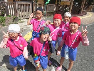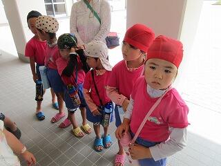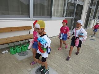 今日から、夏祭りのちょうちん作りがスタート‼部屋にちょうちんの見本を飾っているので、「まだ作らんか?」とちょうちん作りを今か今かと楽しみにしていた子ども達でした。そして、ちょうちんを作りながら、7月の壁画製作も行い、大忙し・・・。しゃくなげ号、製作もあったため、プールには入れなかったので、タライに水を溜めて、足を浸けて、いい気持ち♡「しゃがんでみようや~」と言い、しゃがむと「ズボン濡れちゃったわ~」とプールに入っている気分になっていたのかな?お着替えタイムでした(笑)
