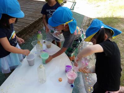 今日は色水遊びをしました。水を入れたペットボトルのキャップに絵の具を少し入れ、シェイク!!あっという間にいろんな色のジュースが完成です。コップに注いでジュース屋さんになったり、友達と色を混ぜて色の変化を不思議そうにしたりして楽しそうでしたよ。ちなみに今日の一番人気は白の「カルピス」でした。