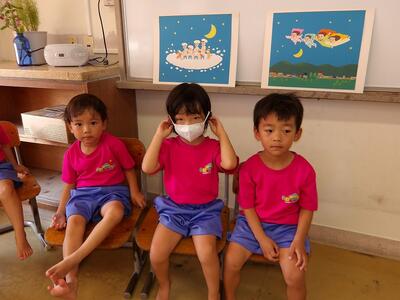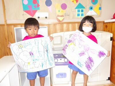 今日は昨日の夏まつりごっこで楽しかったことを絵に描いてみました。絵を描く前から「たこ焼き屋さんをしたよ。」 「ぼくはチョコバナナ!」など昨日の話で盛り上がるちゅうりっぷさん。「大きく描いてみよう。」と保育者が言うと、すぐに描き始める子もいれば、どうしようかな?と悩んでいる子もいましたが、昨日の楽しかったことがたくさんの絵が完成しました。保育室の前に掲示しますので、お子様と一緒にぜひご覧になってくださいね。