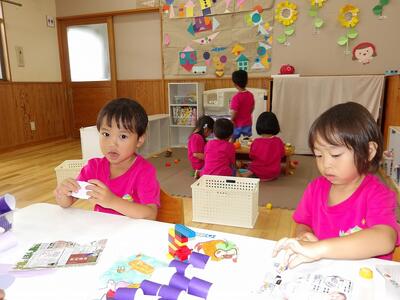 9月の製作でぶどうを作りました。昨日ハサミで切った折り紙を今日は輪にしてぶどうの実作り。くるっとして糊のところにピタッとつけるのが少し難しかったですが、コツをつかんでくると自分のやりやすい方法を見つける子もいてすごいなあと感心しながら一緒にぶどう作りを楽しみました。
