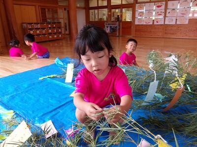 7月7日、今日は七夕の日☆彡ということで、みんなで作ったスイカの笹飾りを笹に飾りました。「朝、お母さんとつけたよ。」と言う子もあり、笹には願い事が書かれた短冊がたくさんついていましたよ。全員が好きな場所につけ、最後にみんなで『願いが叶いますように』とお願いしてきました。いつも頑張っているちゅうりっぷさんのお願い事がどうか叶いますように☆