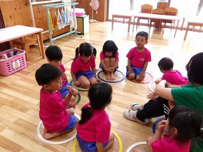コール先生の英会話教室の日でした。今日は動物が出てくる絵本を二冊読んでもらいました。犬や猫、ヤギやカバも出てきて興味津々で聞いていた子ども達でした。あっという間に終わりの時間になり、グッバイソングを歌い終わるとコール先生とタッチがしたくて集まるちゅうりっぷさん。「どこに住んでいるんですか?」とコール先生にも興味津々の子もいましたよ。その後夏祭りリハーサルに参加してから、初めてフルーツバスケットをしてみました。ルールを覚えるまでは???のみんなでしたが、わかるようになるとみんなで楽しく遊ぶことができましたよ。