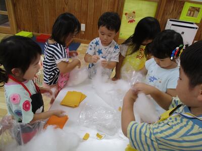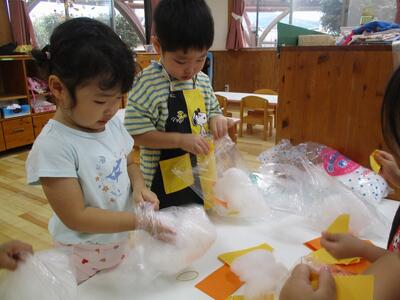 袋の中に綿をぎゅっぎゅっと詰め込んだり、かぼちゃをイメージした色画用紙をちぎって綿と混ぜたりしました。
