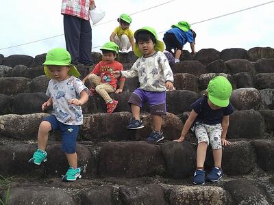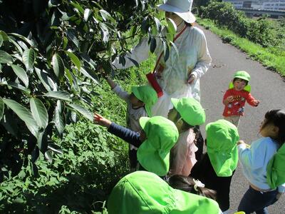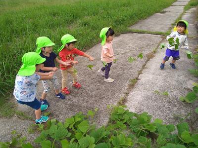 大きな階段を慎重に降りた後は、ながーい蔓で綱引きを楽しんだりクルミを見つけて観察したり、ゆったりと散歩を楽しみました♪帰りには小学生からも声を掛けてもらい嬉しそうなもも組さんでしたよ。