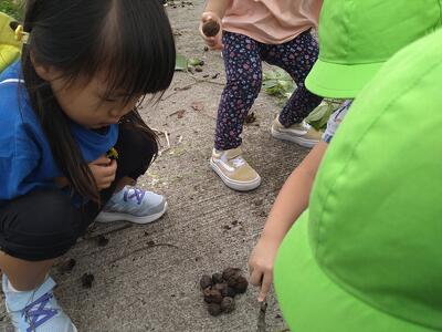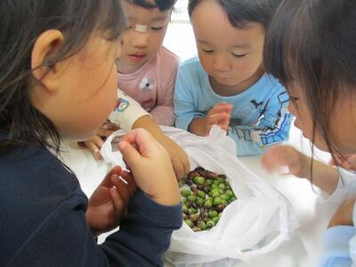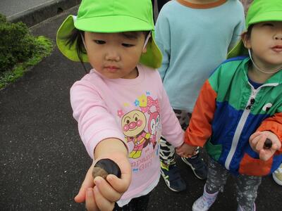 その後散歩に出かけると、とちの実を見つけることができ、「栗だ~♪」と大興奮でした!とちの実は栗にそっくりなので以上児さんみたいに栗拾いをした気分になれちゃいましたね♪