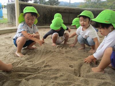 園庭では砂場が大人気!「砂場であそんでねー…」とは言ってないんですが、自然と砂場に集まってくるもも組さんでした!