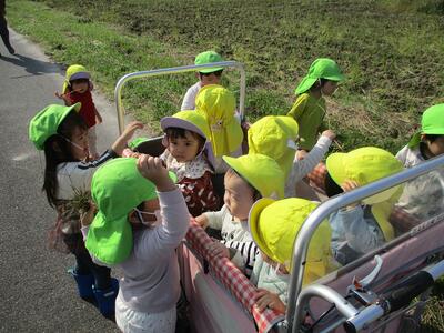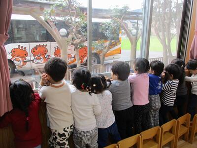 今日は3歳以上児さんがバスに乗って栗拾いに出掛けたので、もも組の部屋からラドンバスが見えると、「あ~バス~!」と皆が釘付けでした。ある子がイスを持って窓の外を眺めていると、皆が真似をして窓の外を眺めていて可愛かったです♪