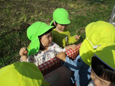 採取した自然物を見せてあげたり、にこにこおしゃべりをしたり、年下にも優しい子ばかりのもも組さんです♪