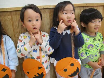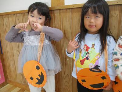 ハロウィンのお菓子入れが完成したので、みんなで記念写真をパシャリしました♪