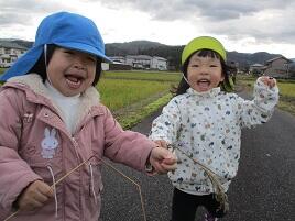 午前中は太陽が出ていたので、晴れ間を狙ってお散歩に出掛けました。友達と手を繋ぐのが嬉しくてルンルンで足取りの軽い子ども達。お話をしたり、さんぽの歌を歌ったりして楽しそうでした。農道には背の高いススキがあり「うんとこしょ、どっこいしょー!!」と言いながらススキを引っ張ったり、黄色や赤になった葉っぱに興味を示したり、草花を取ったりと、たくさん触れて遊びました。帰り道は、みんなで走ってみました。とても元気よく走り、たくさん笑い声が聞こえました。