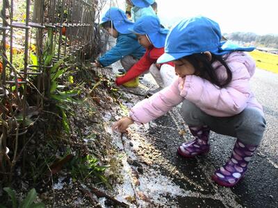 「雪を探しに行こう‼」と外へ出発。「雪あるかなー?」なんておしゃべりしながら歩いていました。道の端にほんの少し、白くキラキラ輝くものが。「雪だー‼あったー」と嬉しそうに駆け寄って指でツンツン触っていました。「冷たーい。」と声を上げ喜んでいました。ほんの少しの雪でしたがとっても楽しそうに遊んでいました。