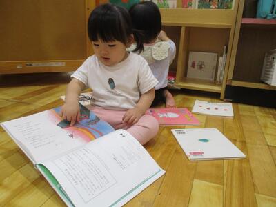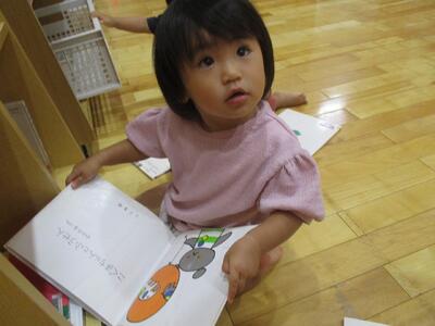 今日は、絵本貸し出しがありました。気になる絵本を本棚から引っ張り出してパラパラめくる子ども達。選ぶときは、床が絵本だらけになっています!気に入った絵本が見つかると保育者に渡したり、大事そうに持ち歩いたりしています。絵本が大好きないちご組さん、借りた絵本をお家でもたくさん見て楽しんでね!