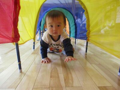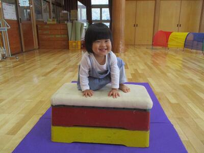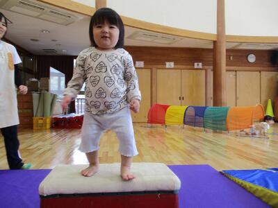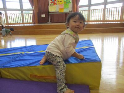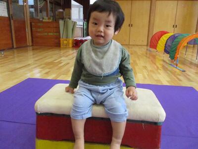 今日は、ホールでトンネルや跳び箱、坂になっているマットなどを出して遊びました。跳び箱の上に立って、嬉しそうな子ども達。降りるときは足から降りたり、ジャンプして降りたりしていました。歩ける子が増えてきて、嬉しそうに探索活動をしたり、高いところに登ったり、体を動かすことを楽しんでいます。