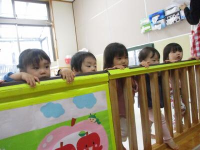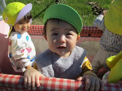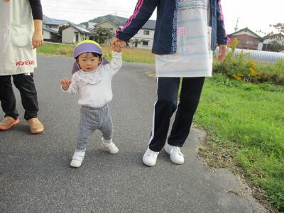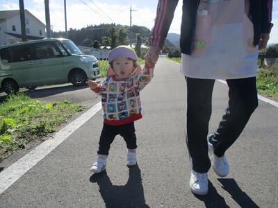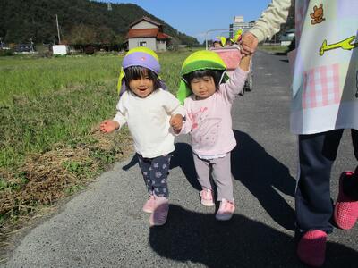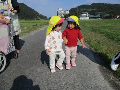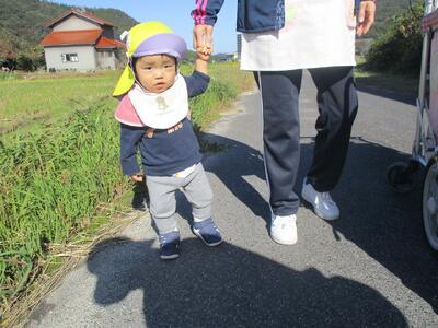 今日は、お散歩で農道をぐるっと一周しました。保育者や他児と一緒に手を繋いで歩いてみると、手を離すことなく上手に歩くことが出来ました。もも組さんに出会うと嬉しそうにしたり、車が走っているのを見てブッブーと指差したり、楽しそうないちご組さんでした。少しずつ手を繋いで歩く距離を増やしていきたいと思います。