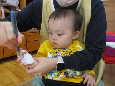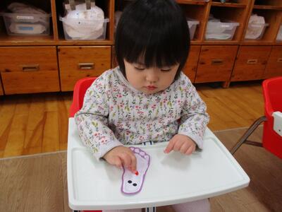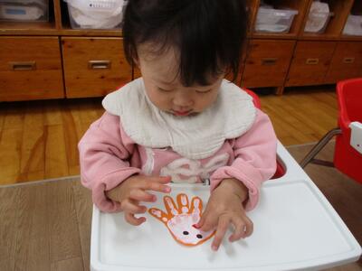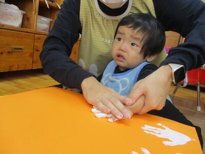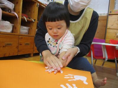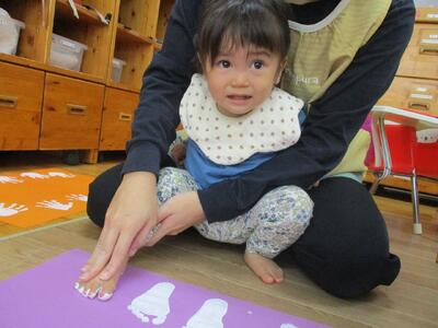 今日は、ハロウィンのバックをつくるために手形と足形を取りました。製作の準備をしていると「なにするの?」とみんなが寄ってきて楽しみにする子ども達でした。絵の具の感触を嫌がる子もいましたが、みんなが上手に手や足をパーにしてくれました。どんなハロウィンバックが完成するかな!?ハロウィンパーティーが楽しみです!