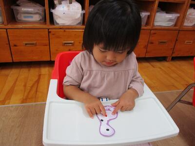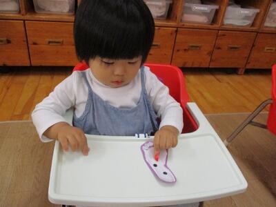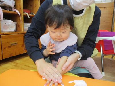 今日は、ハロウィンバックにするおばけ製作でみんなの手形と足形に小さな丸シールを貼って顔を完成させました。以前貼ったシールより小さかったので更に苦戦する子ども達。右手左手とシールを持ち替えながら自分で工夫してどうにかくっつけようと頑張っていました!できた後は、笑ったり、拍手したり嬉しそうにするいちご組さんでした。