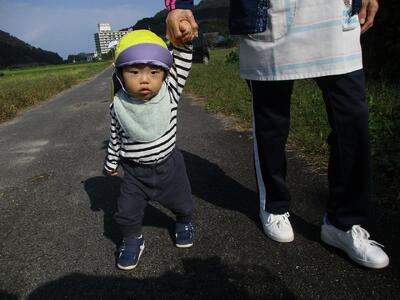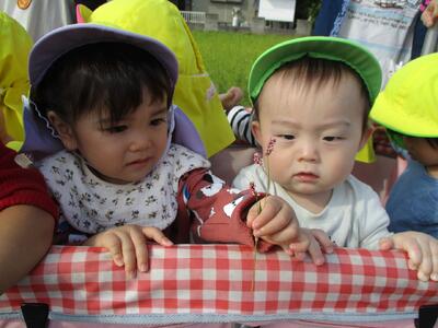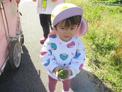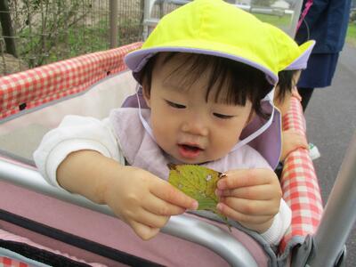 今日は、いい天気だったので農道に散歩へ行きました。お名前を呼ぶと「はい!」と返事をして、一人一人帽子をもらって外へ行く準備をします。まだ上手には被れないですが、嬉しそうに頭の上に乗せたり、窓の方へ集まったりする子ども達でした。自分で草花を取ったり、虫を触ろうとしたり色々なものに興味を持って楽しんでいました。