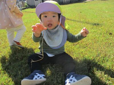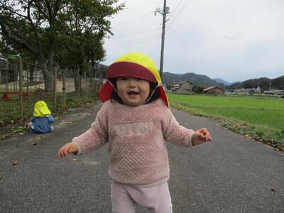 今日は、農道散歩をしました。赤い落ち葉や黄色い落ち葉、色々な落ち葉を見つけて拾ったり、ちぎったりして遊ぶ姿がありました。長いつるを引っ張ってみたり、バッタに興味津々で触ろうとしたり、秋の自然に触れながら散歩を楽しむ子ども達でした。