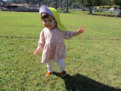 今日は、園庭に出て遊びました。戸外で遊ぶことが増え、靴を履くことに慣れてきたようで最初の頃よりスタスタ歩くいちご組さん。広い園庭を自由に歩き回って、滑り台や登り棒、くじらやまなど様々な遊具や場所に触れていました。滑り台では、少し怖くて慎重に滑る子や一人でシューっと滑る子、反対から登ろうとする子など色々な姿がありましたが、みんなとても楽しそうにしていました。