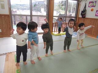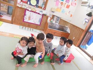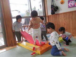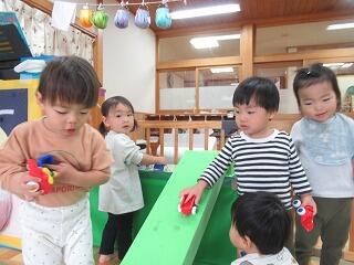 今日はお部屋で車の玩具で遊んでいると、もっといろいろな走らせ方をしたいみかん組さん。ソフト積み木を持ってきてスロープを作ると、早く滑り落ちる車を追いかけて喜ぶ子ども達。絵本を立ててトンネルと作る子や、スロープの下をトンネルに見立ててくぐる子など、様々な遊び方を楽しみました。そのうち、ソフト積み木に乗りたい子ども達。今度は長い平均台を作ると、みんなが座ってバスごっこの歌に合わせて体を動かし、「ゴーゴー!」と楽しみました。バスごっこの後は、平均台を恐る恐るわたってバランスを取ってみたり、ジャンプしてトランポリンのように飛び跳ねて楽しみました。
