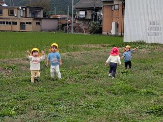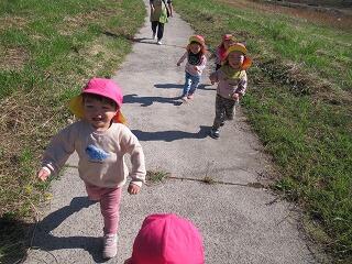 今日は旧三朝小学校までお散歩に出かけました。グラウンドはとても広く、思わずかけっこしたくなるみかん組さん。みんなでか「よーいどん!」の掛け声とともにかけっこを楽しみました。広いグラウンドになかなかゴールできないみかん組さん。途中で疲れてしまった子は座り込んで休憩~。息を整えてまた立ち上がり、端から端までかけっこを楽しみました。