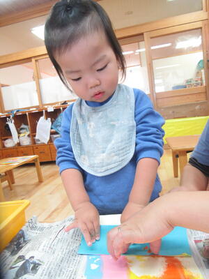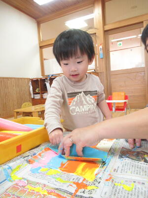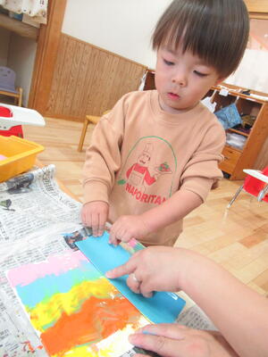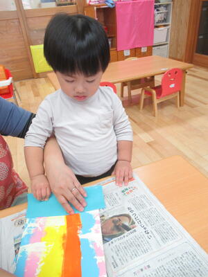 今日は製作をしました。画用紙に絵具を乗せて、厚紙で上から押えて動かせて、縞模様を作りました。上手に押さえられず、手を離してしまう子は一緒に押えて模様付けをしました。力加減では、絵具が薄い部分もありましたが、それぞれ、違った模様ができました♪