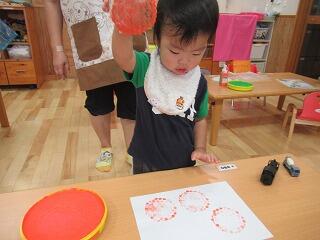 今日は、廃材や手形を使って万国旗作りをしました。保育者が製作の準備をしていると、早くしたくてぴょんぴょん跳ねる子ども達。スタンプ台にたっぷりインクを付けて上手にスタンプしていました。たくさんの可愛いみかんができました。また運動会で飾るので、楽しみにしてくださいね♪