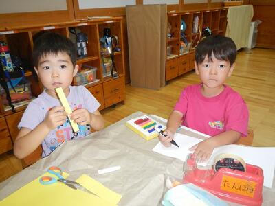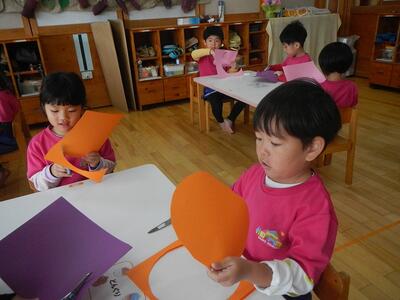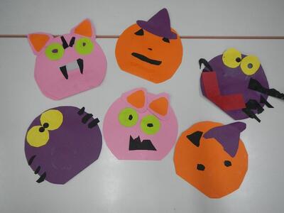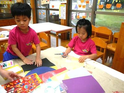 楽しみにしているハロウィンへ向けて、バックを作りました。化け猫、クモ、ジャッコウランタンの中から選び、好きなものを作りました。目、鼻、口など、思い思いの形を書いて切って張り付けて出来上がりました。どれも個性豊かでかわいらしいバックになりそうです。ハロウィンの日が待ち遠しい子ども達です。