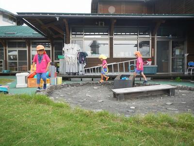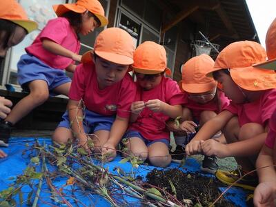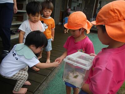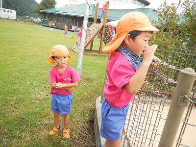園庭であそんでいると、虫がいたり、どんぐりがあったり…♡楽しいことがたくさん‼小さい友達に捕まえた虫を見せてあげたり、朝顔の種をとったり、プールをのぞいたり、遊具であそんだりと、満喫していました。