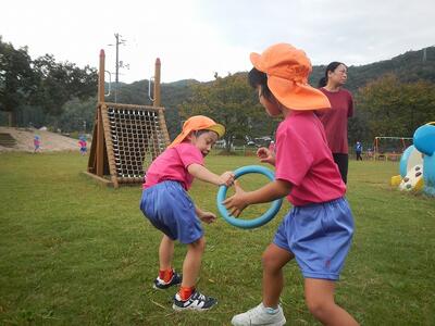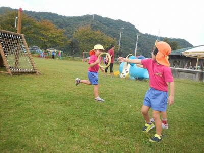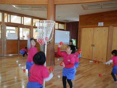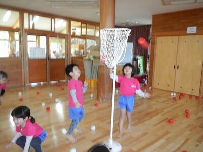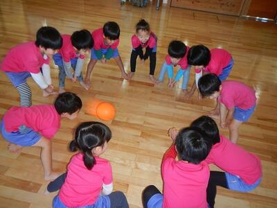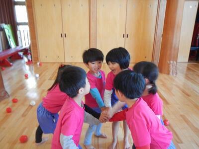 今日は、みんなで玉入れやフランスのゲームとまとをして遊びました。玉入れはいつもと違い、赤いかごには白い球、白いかごには赤い球という、面白ルールで挑戦‼いつもと違う玉入れで盛り上がっていました。とまとゲームは、白熱した遊びが繰り広げられていました。いつの間にか円陣を組んで「頑張るぞー‼おー。」と掛け声も‼思いっきり楽しんでいました。