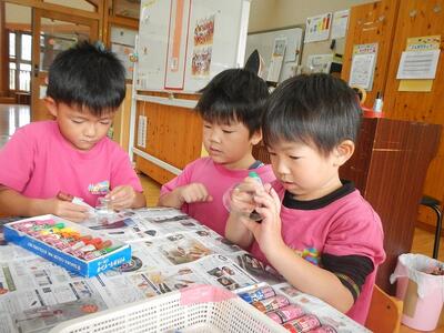 今日は製作遊びをしました。アクセサリー作りでは、好きな色のマジックで色を塗ったり模様をかいたりしておしゃれにデコレーションしていました。さつまいも作りはさつまいもの色塗りをしました。おいしそうな芋になるように筆で絵の具をたっぷり塗っていました。色ずくと本物そっくりになったさつまいもでした。製作大好きなたんぽぽ組です。