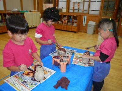 先日収穫したさつまいもを並べて観察すると、いろんな形や大きさの芋がありました。焼き芋大会を心待ちにしている子ども達と、新聞紙を使ってさつまいもつくりをしました。くしゃくしゃに丸めた新聞紙は様々な形に変身‼大きいのや小さいの。丸いのや長いの等、好きな形のさつまいもを作りました。「こんな大きい焼き芋が食べたーい。」とつぶやいていました。次回は芋に色を付けようかな‼