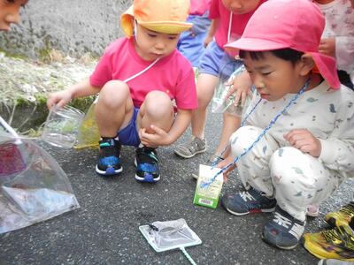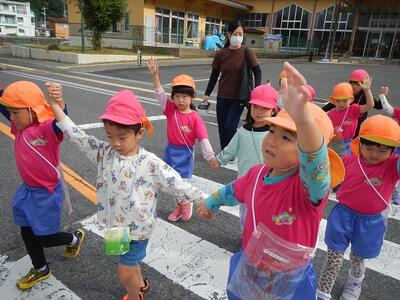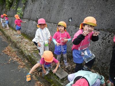 みささこども園のきりんぐみさんと年中児交流会をしました。2回目となった今日は、みささこども園に遊びに行かせてもらいました。こども園周辺のお散歩コースに連れて行ってもらい、溝をのぞいてカニを探したり、木の実拾いをしたりしました。初めてのコースにテンションMax‼こども園の友達や先生ともたくさん会話をしながら楽しいひと時を過ごしました。最後には、プレゼント交換をし、また会えるのを楽しみにお別れしました。