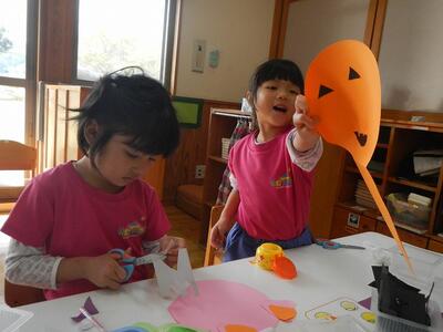 10月と言えば…ハロウィン‼みんなハロウィンパーティーを楽しみにしています。今日はハロウィン製作をしました。紙を切ったりちぎったりして顔を描いたらハロウィンオバケの完成。かわいいオバケたちがお部屋の窓を彩っています。オバケだけでなく、「目玉オバケ作ろう。」 「キャンディーも作ろう」と次々政策の魔法がかかり、あっという間にハロウィン窓が完成しました。毎日パティー気分で楽しく過ごせそうです🎃
