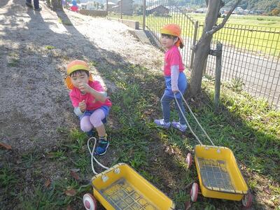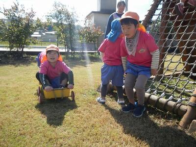 友達と一緒に気持ちの良い青空の下で遊び、笑顔がいっぱいでした。手押し車に友達をのせて引っ張ったり、くじら山で木の実を拾ったり、壁につたうカマキリをじっと眺めるなどして、友達との会話も弾んでいました。