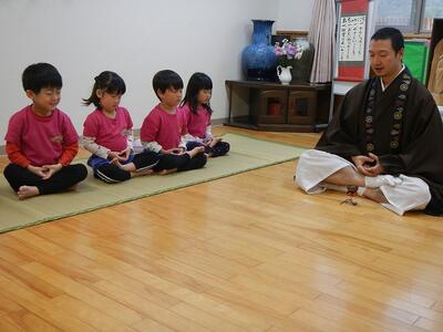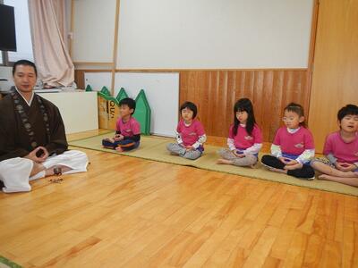 三徳山に一休さん体験に出掛ける予定でしたが、雨が降り残念ながら園での坐禅体験をしました。和尚さんとの会話を楽しみながらも坐禅になると心落ち着かせて座ることに頑張っていました。坐禅の後は、感謝の気持ちを込めてダンスを披露し、いつもお世話になっている和尚さんに感謝状とお花をお渡ししました。いつもありがとうございます。
