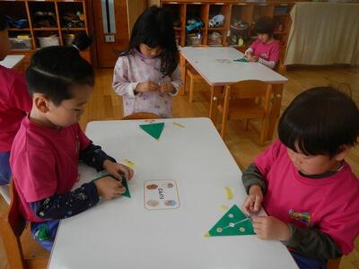 12月になり、早速クリスマスを楽しみにしている子ども達。今日はクリスマスツリーを折り紙で折りました。早くこいこいクリスマス🎄