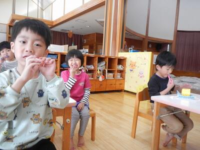 歯磨きタイムの様子です。音楽に合わせて歯ブラシを動かして歯をピカピカに‼