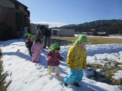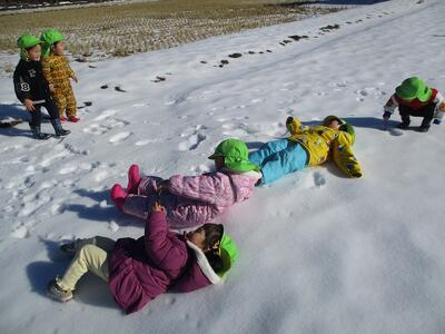 その後は雪遊びへ…園庭に10㎝ほどは雪が残っていたので、ウキウキしながら雪に触れて楽しんでいました!