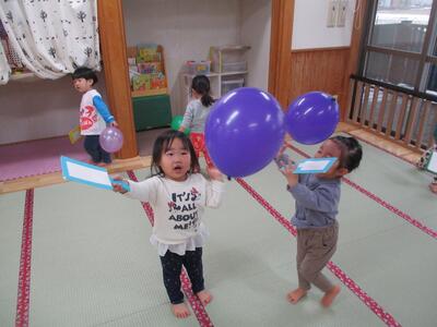 カルタのあとは、羽つきならぬ【風船つき】を楽しみました。フワフワ浮かぶ風船を元気に追いかけ、思いきり羽子板でバチーン!としていて気持ち良さそうでした(笑)