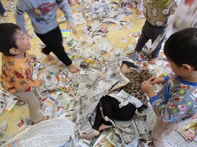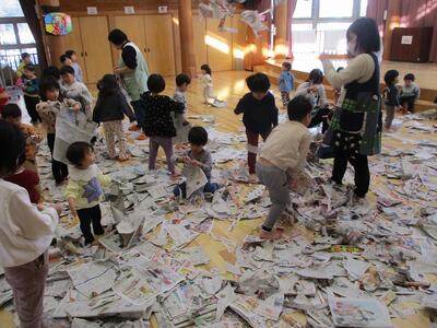 その後は、ホールで全クラス一緒に新聞紙で遊びました。ちぎってポイっを繰り返しているとあっという間にホールは新聞紙だらけ…寝転んだりかきわけたりしながら大盛上がりで遊んだ子ども達でした♪