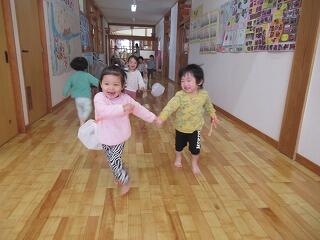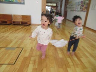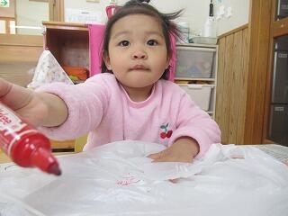 今日は凧作りを製作しました。ナイロン袋にマジックで絵をかいて、紐をつけて廊下でたこあげを楽しみました。ナイロン袋で作った凧がふわっと上がり、喜ぶ子ども達。何度も廊下を行ったり来たりしながらたこあげを楽しみました。