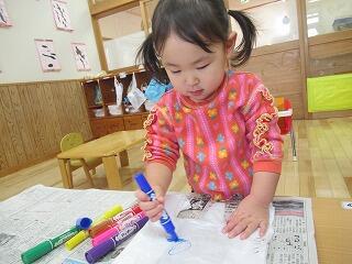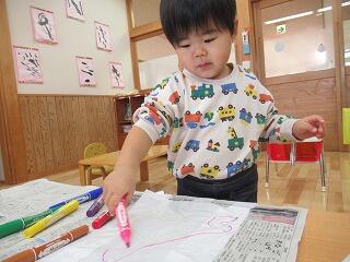 今日は書初めをしました。初め、筆を見て手形スタンプをすると勘違いした子は筆を渡そうとすると、手の平を出してきました。筆を持って書くことを知らせると、恐る恐る筆をもって書いていました。書いていくうちに筆の感触が楽しくなってきたのか、半紙にいっぱいに描く子、同じ場所を塗るように書く子、点ばかり書く子とそれぞれ書初めを楽しみました。