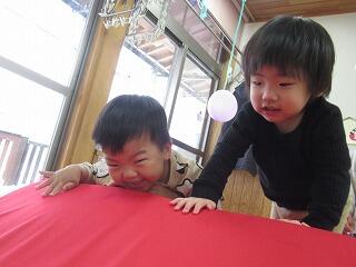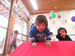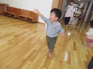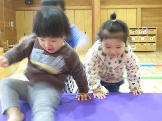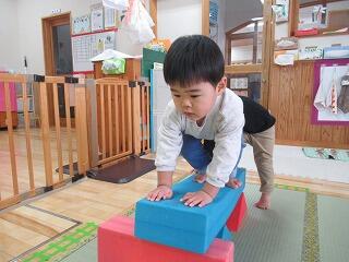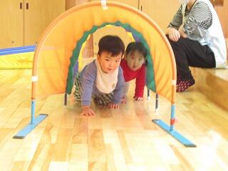 今日はホールででこぼこ平均台やトンネル、跳び箱、マットなどを組み合わせてサーキット遊びをしました。自分の好きな場所へ走っていく子や、保育者の後を嬉しそうについていく子、トンネルの中で友達と一緒に寝転んで「気持ちいいね」とこそこそ内緒話を楽しんだり、それぞれが体を動かして、時々休みながらもホールでたくさん遊びました。