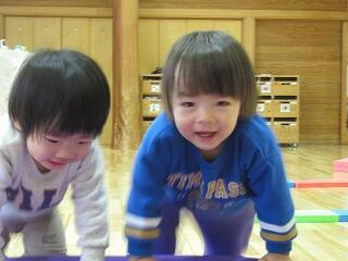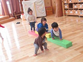 今日はお部屋でサーキット遊びをしました。でこぼこ平均台やソフト積み木やマットの坂道を組み合わせて体を動かして楽しむ子ども達。ソフト積み木を組み替えたらもっと面白くなるんじゃないかと自分たちで組み立て始め、シーソーみたいにして動きを付けてみたり、傾斜をつけて下り坂を作ったり、もちろん保育者もお手伝いしましたが、夢中になって遊びました。お外は雪で寒そうでしたが、室内は子ども達の熱気で暖かかったです。
