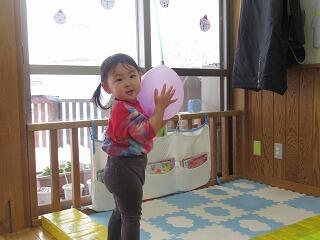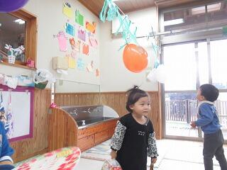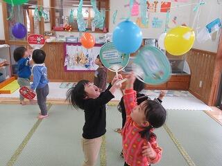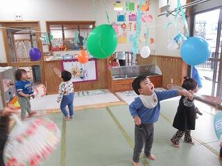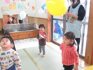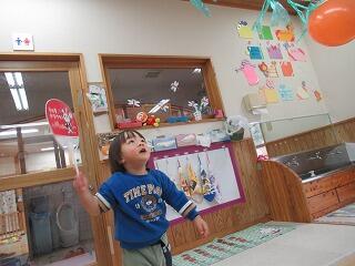 今日はお部屋で風船と団扇を使って羽根つきを楽しみました。紐をつけて上から吊るした風船を団扇で打って楽しみました。はじめは弾いて楽しんでいた子ども達でしたが、次第に打ち方のコツを掴んだのか、テニスの選手のようにバシッとスマッシュを何度も決めて汗を流して楽しみした。