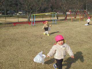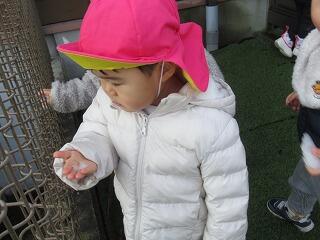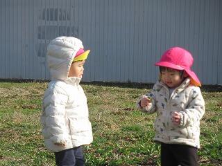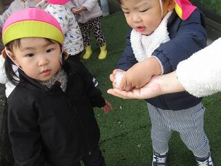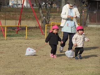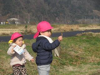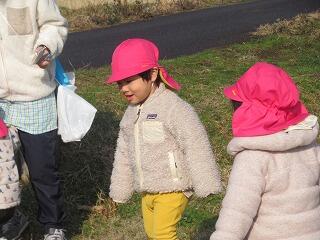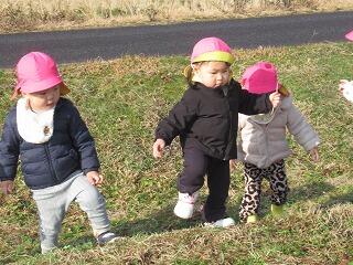 今日は農道までお散歩に出かけました。お天気が良くて、久しぶりのお散歩でした。原っぱでかけっこを楽しんだり、「はっぱのなかでみいつけた!」と発表会でのセリフを言いながら、野花を摘んだり、石を見つけて散策を楽しみました。帰りにホールで遊んでいるいちご組さんに外から声を掛けて窓越しの交流を楽しんだり、日陰になっているところに雪が少し残っていて、触ってみると、「つんたいね~(冷たいね)」と大事そうに持って帰る子もいました。でも、園につく頃には溶けてしまい、「ない~」と不思議そうに手のひらを見つめるみかん組さんでした。