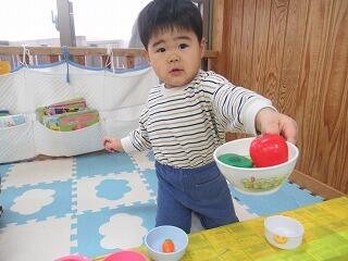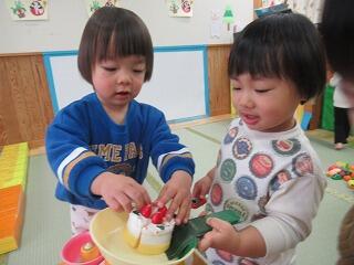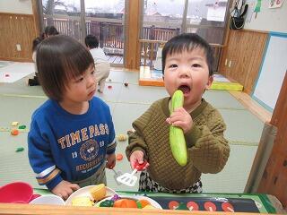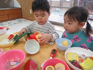 今日は、お部屋でおままごとをして楽しみました。それぞれ好きな食べ物の玩具は決まっているのか、魚ばかりを料理したり、ケーキを四つくっつけて、料理したり、キュウリを大事そうに持ちまわったり、スイカを四つくっつけて丸いスイカを作ったり、それぞれがお料理を楽しみました。