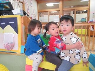 今日で保育園も今年最後になりました。皆でお部屋をきれいにお掃除しました。新聞紙を持って窓ガラスをきれいに磨いたり、発表会で使った大道具を片付け、残った段ボールでお家のように入ってみたり、皆でぎゅうぎゅうに入って楽しんだり、電車のように走ってみたり、楽しみながらも最後は段ボール、小さなごみなどに分けて、お部屋がすっきり、ピカピカになりました。